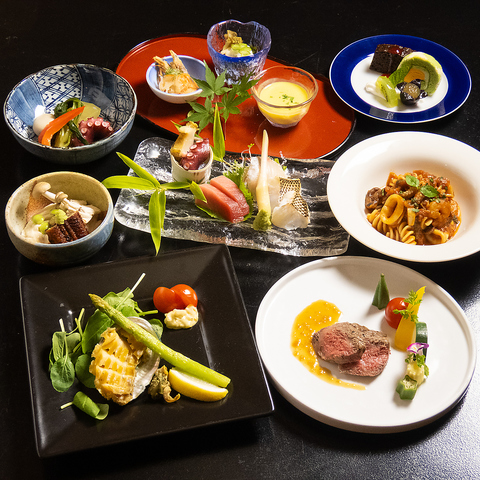 こちらコースは、伝統的な和の技法と現代的な洋のアプローチが組み合わさった料理の数々をお楽しみいただけます。目にも美しい一皿一皿は、職人のこだわりが詰まっており、味わいも格別です。視覚、嗅覚、味覚のすべてを刺激する独特の体験を、ぜひご堪能ください。