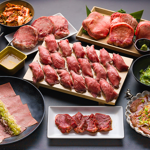 当店自慢の牛タンメニューの数々に加え仕入から厳選されたカルビ、ロースや特選ハラミ流行りの赤身肉、流通量の少ない和牛のレバーやハツまでこだわりの40品が全て食べ放題!