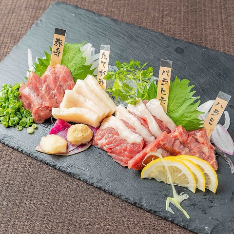 熊本名物!馬刺しは希少部位もございます!その他の郷土料理や地酒と一緒にお楽しみください!【新市街 ハッピーアワー 安い 馬刺し 地酒 飲み放題 鍋 しゃぶしゃぶ もつ鍋 焼き鳥 忘年会】