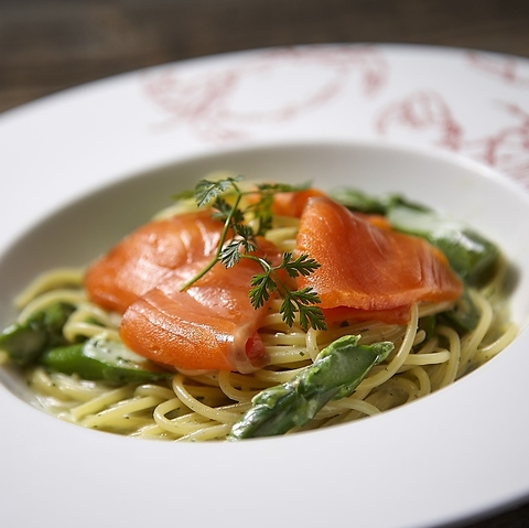 濃厚な味わいのスモークサーモンとシャキッと食感のアスパラをバジル香るクリームソースと合わせたパスタです。