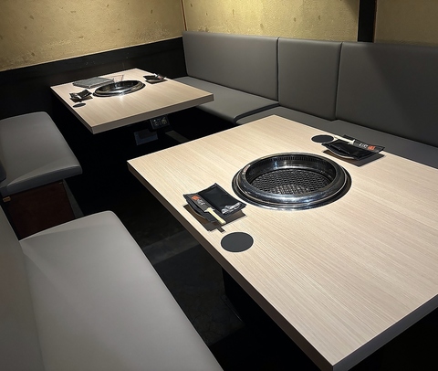 【店内テーブル席】お一人様からファミリー、団体様まで幅広くご利用いただけます。落ち着いた雰囲気で街の喧騒を忘れ召し上がる絶品の焼肉は、お客様をうっとりとした気持ちにさせてくれます。高級感のあるテーブルで非日常の空間をお楽しみください☆