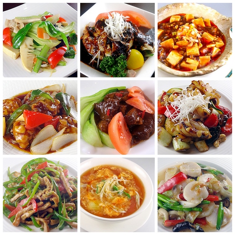■本日の前菜4種盛り合わせ■鮮魚の中華風お造りor揚げ物3種盛り合わせ■蒸し物3種盛り合わせ■蟹肉入りフカヒレスープ■選べるこだわりメイン料理2種(詳細は別記載)■蟹入焼飯or葱汁そば■デザート盛り合わせ■コーヒー