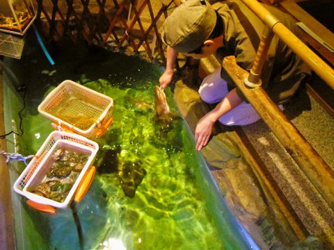 水槽では釣り糸を垂らして釣りが楽しめる。料理ができるまで釣りをしていれば子連れでの来店でも退屈しない。