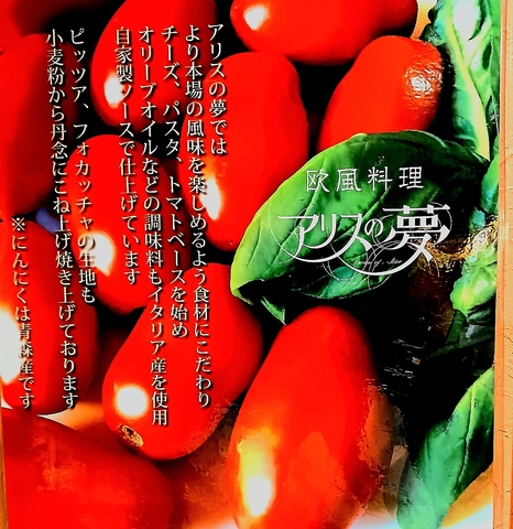 アリスの夢ではより本場の風味を楽しめるよう食材にこだわり、チーズ、パスタ、トマトベースを始めオリーブオイルなどの調味料もイタリア産を使用。自家製スープで仕上げています。ピッツアフォカッチャなどの生地も小麦から丹念にこね上げ焼き上げております。