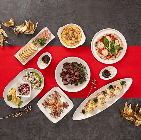 オープンキッチンならではの目の前で仕上げる料理の数々をはじめ、焼きたてピッツァやパン・茹で上げパスタ・グリル・鉄板焼、そして見るも眩い数々のオードブルがずらりと並んだビュッフェボードから、お好きな料理をお好きなだけお召し上がりいただけます。