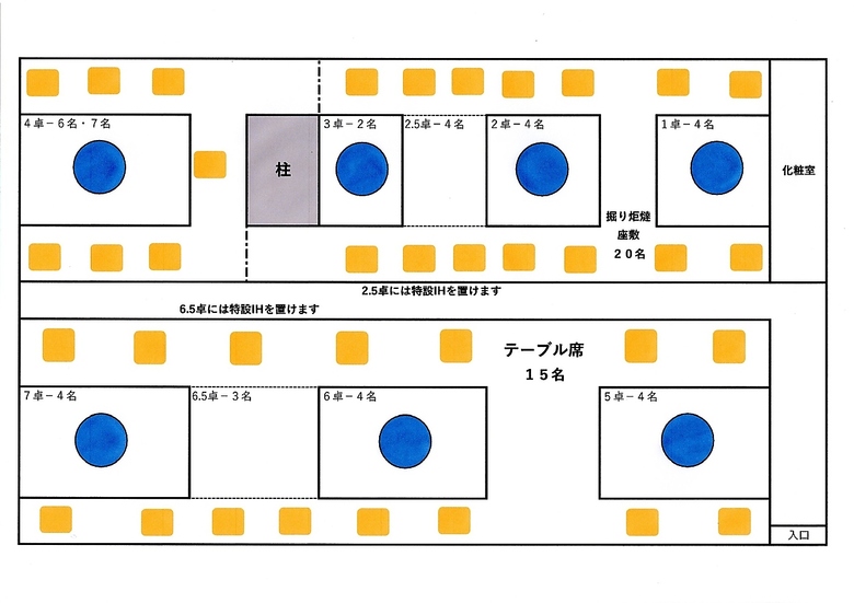 | 掘りごたつ | あり :2名~の掘り炬燵のお座敷をご用意いたしております。 |