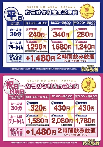 カラオケを楽しむならおさるの村へ!24時間営業!リーズナブルな価格でカラオケを愉しもう!※12月は赤色の料金となります。ご了承下さい。