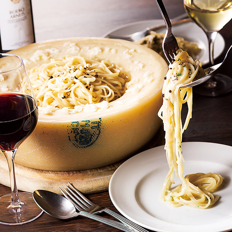お客様の目の前で仕上げる絶品チーズパスタ♪イタリア直送の大きなチーズをとろ~り溶かしてパスタやリゾットを濃厚なおいしさに!写真や動画もご自由に♪
