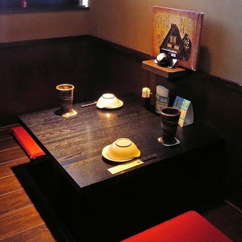 掘りごたつタイプのお席は足をおろしてゆったりおくつろぎ頂けます♪様々な個室をご用意しておりますので、人数に合わせたお席にご案内いたします!会社飲み会や2次会、お友達同士、ご家族でのご利用にもおすすめ◎古民家風の造りはまどろみの時間を演出。自慢の創作料理で最高の時間をお過ごしください♪