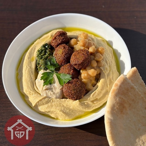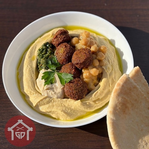 当店で仕込んだ自家製のフムスと、こんがりサクサクに揚げたファラフェルを一皿で味わうことができるプレートにしました♪なめらかなペースト状のフムスと、食感の良いファラフェルのハーモニーをお楽しみください。