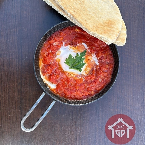 シャクシュカは、トマトとパプリカのスパイシーなソースで卵を煮込んだポーチドエッグ。パンチのきいた美味しさはお酒とも相性ばっちりです☆大勢でシェアできるサイズのダブルシャクシュカ2350円(税込)もございます◎