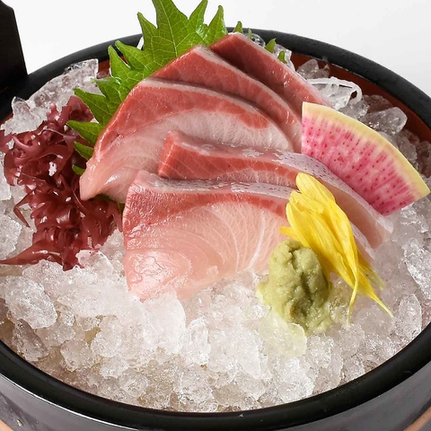 お席で実際見た時の驚きを感じていただきたい自慢の「名物!桶盛り」。桶の上に氷が引き詰められ市場直送の鮮魚が並びます!ご来店されたほとんどのお客様がご注文される桶盛りは必食です。桶盛り5種盛りと大桶7種盛りで皆様も自然と笑顔に◎人数に合わせてどうぞ。※写真は7点盛り※写真は一例です。