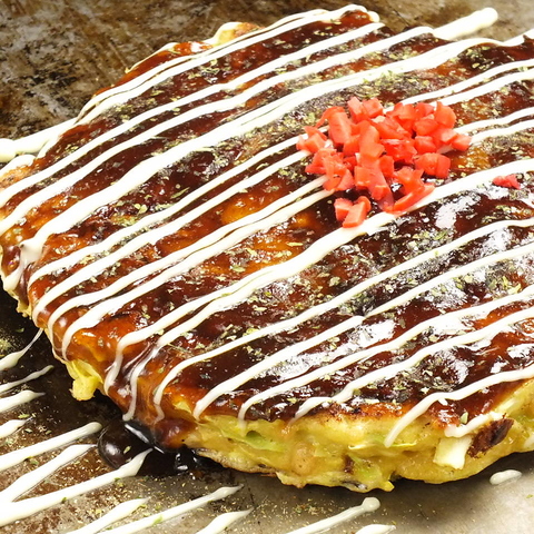 薄焼きと呼ばれる薄い生地の上にキャベツ、モヤシ、ソバ半玉を乗せて焼き上げます。関西風お好み焼きに比べて小麦の量が少ないのでヘルシーです。※お値段について詳しくは店舗にお問い合わせください