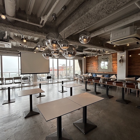 江ノ島から茅ヶ崎を臨む大眺望が◎オーシャンビューで貸し切りPartyはいかがでしょうか♪3Fは100名様までフロア貸し切りも可能で、結婚パーティーや二次会など各種パーティーにも大好評です。DJブースや100インチスクリーン、プロジェクターやワイヤレスマイクなど充実の設備をご用意しております。