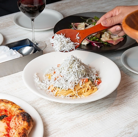 しらすと大葉のペペロンチーノにオプションで「しらすかけ放題!」好きなだけしらすを堪能