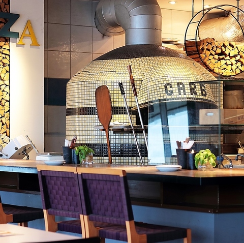 本格Pizza窯を望むカウンター席。活気ある厨房が見渡せる隠れた人気席です