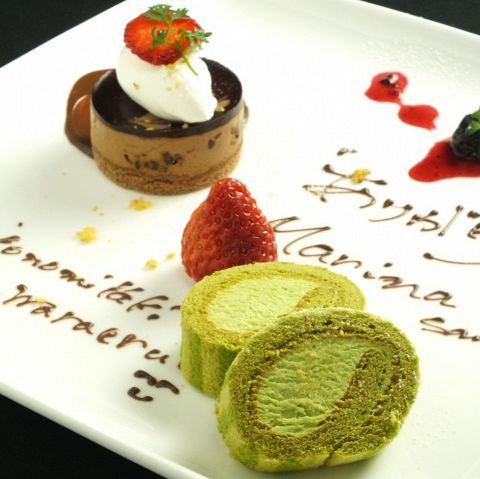 パティシエ出身が作るスイーツは別格!!歓送迎会やお誕生日などのお祝いに♪お名前&メッセージ入りスイーツ盛合せをプレゼント!2~3名様は見た目もキュートなデザートプレート、4名様~ホールケーキになります!※前日までに要予約。