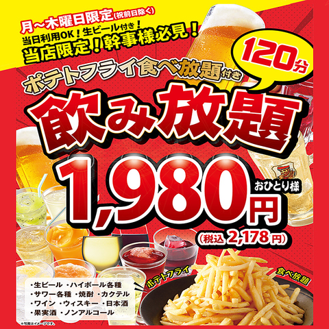 【月~木限定】当日利用OK!ポテト食べ放題付き120分飲み放題を2178円(税込)でご提供!※祝前日を除く