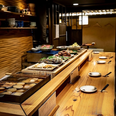 おばんざいがずらっと並ぶカウンター席。京都ならではのほっこり落ち着く空間です。