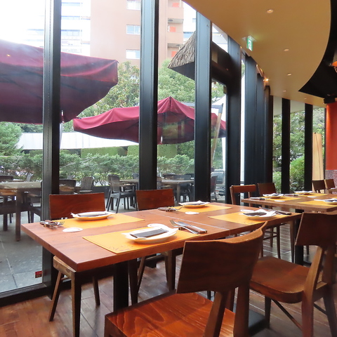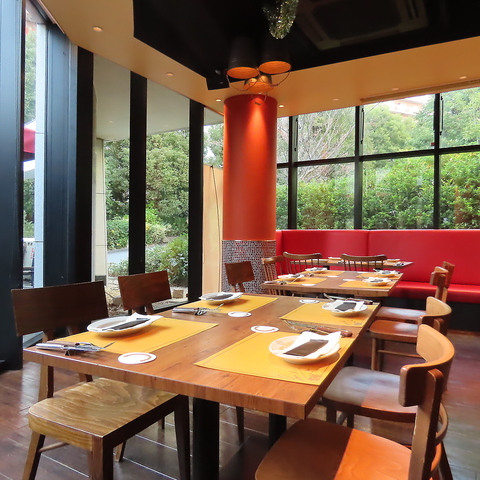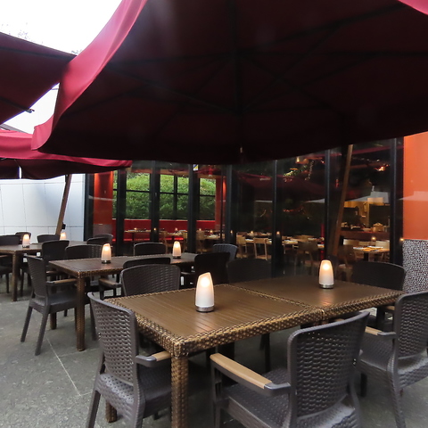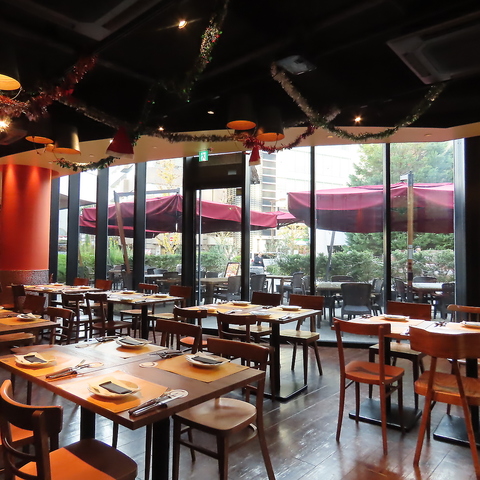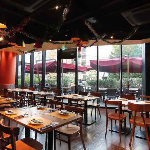 夜になると綺麗にライトアップされ、雰囲気がグッとおしゃれになり、テラス席でちょっと一杯にはもってこい☆一面大きなガラス窓で店内外、どちらから見ても開放感が溢れます♪