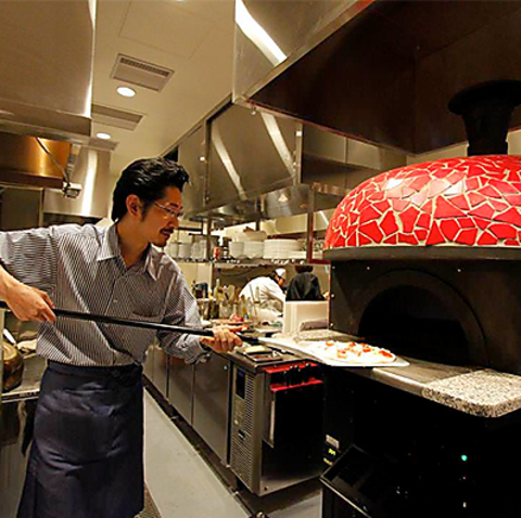 ナポリスタイルの本格的なピザを、窯焼きでお楽しみいただけます。お客様のお席からもオープンキッチンに置かれた窯をご覧いただけます。