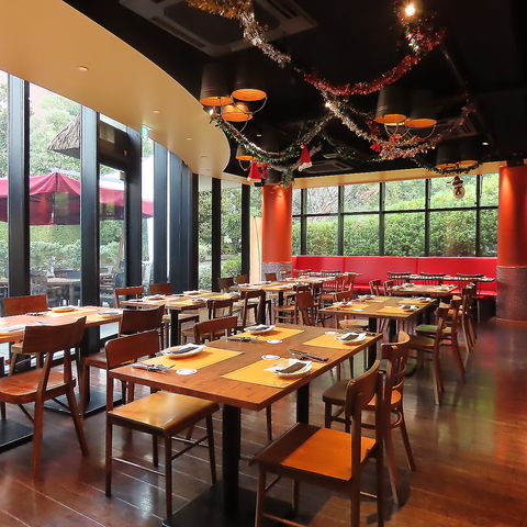 夜になると綺麗にライトアップされ、雰囲気がグッとおしゃれになり、テラス席でちょっと一杯にはもってこい☆一面大きなガラス窓で店内外、どちらから見ても開放感が溢れます♪