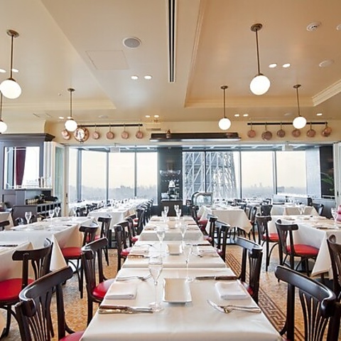 東京スカイツリータウンの30階に位置する店内は、大きな窓から差し込む光が心地よい開放感を生み出しています。暖色系のライトが灯る空間にはシャンソンが流れ、まるでフランスにいるかのような本場の空気感を再現。広々としたテーブル席で、高層階ならではの眺望と共に至福の食事時間をお過ごしください。