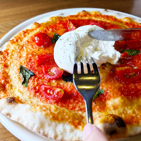 小麦粉・チーズ・イーストまで本場イタリアから取り寄せ、400度の石窯でカリッと焼き上げた自慢のピッツァ!薄生地で、ボリューム満点にのせられた具材を楽しむことのできるピッツァは、他では味わえない絶品です!ビールやワインとの相性も抜群です!
