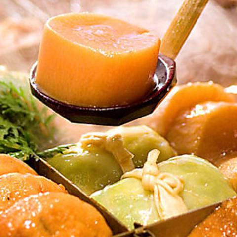 南国の地、鹿児島に「なぜおでん?」と思われるかもしれませんが、先代から受け継がれ、70余年、つぎたしつぎたし受け継いでいる伝統の味です。これまで休むことなく、その味を守ってきました。色が琥珀色で白味噌仕立て。ネタは、鹿児島の食材をふんだんに使用。受け継がれた秘伝の味を是非ご賞味ください。