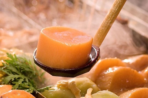 南国の地、鹿児島に「なぜおでん?」と思われるかもしれませんが、先代から受け継がれ、70余年、つぎたしつぎたし受け継いでいる伝統の味です。これまで休むことなく、その味を守ってきました。色が琥珀色で白味噌仕立て。ネタは、鹿児島の食材をふんだんに使用。受け継がれた秘伝の味を是非ご賞味ください。