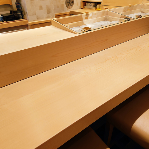 無垢の木曽檜の一枚板を用いたカウンターは、木の温もりもほのかな香りも楽しめる贅沢な空間となっております