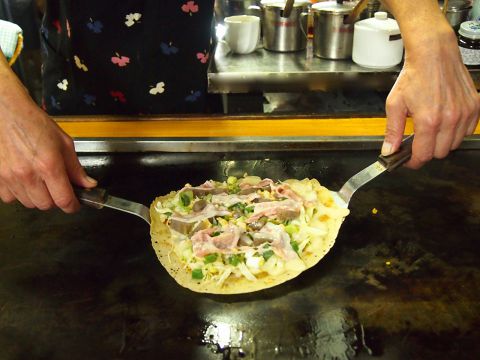 年季の入った分厚~い鉄板でジュ~ジュ~と美味しい音を立てて焼くお好焼は、フワフワで絶品。