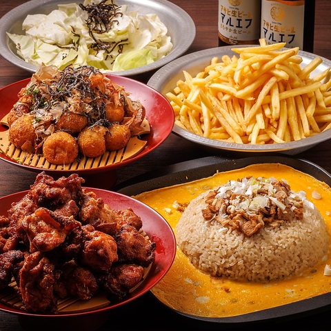 大人気定番メニューの枝豆やポテトフライ、ヤンニョムチキンなどを“デカ盛り”と“どデカ盛り”でご堪能いただけます♪みんなでシェアしてもよし!1人でガッツリ食べてもよし!デカ盛りコースは飲み放題付きで3,300円◎詳細はコースページへ
