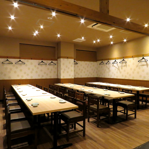 【貸切OK!】開放感溢れるテーブル個室も完備しております。最大50名様までご利用可能なので、忘年会・新年会・同窓会等の各種宴会に是非ご利用ください。さらに貸し切りなら102名様までOK♪宴会にピッタリの「横断幕」or「寄せ書き焼酎ボトル」特典付きプレミアムコースもご用意しております!