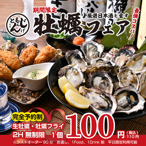 新鮮でぷりぷりな海のミルク「生牡蠣」と、外はサクサク中はとろける旨みたっぷりの「牡蠣フライ」が1個100円で楽しめる『牡蠣フェア』開催中!なんと個数制限なしの超破格値◎さらに、牡蠣と相性抜群の厳選日本酒をご用意しました。+1,980円で「厳選日本酒付き飲み放題」も追加OK!