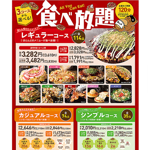 食べ放題は3種類あります♪レギュラーコース、カジュアルコース、シンプルコースからお選び頂けます。