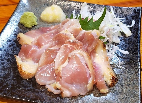 酉ひでのもう一つの名物『鶏タタキ』。表面を香ばしく炙り、絶妙な火入れで中はしっとりレアに仕上げました。噛むほどに広がる濃厚な旨味と、さっぱりとした後味が絶妙に絡み合う逸品。薬味との相性も抜群で、お酒のアテにもぴったり!骨付鶏と並ぶ自慢の味わいをぜひご堪能ください。