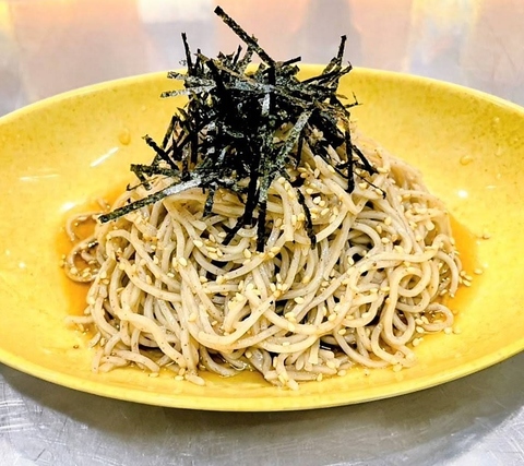 麺は足立製麺所の手打ち特製麺で麺にもエゴマの粉を混ぜています。素朴で香ばしい蕎麦の風味にエゴマの粉を練り込みなめらかで特別な風味を醸し出しております。さらにエゴマ油を使用した特製のつゆで香ばしさと奥行きがあります!