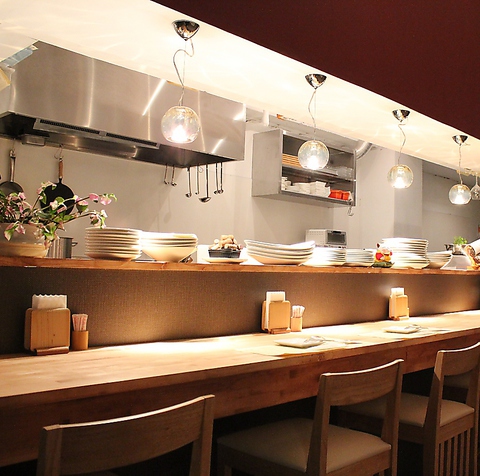 店舗入口のドアを開けると、オープンキッチンのカウンターが広がります。席間は広め。気軽に飲みたいお一人様や女子会・デートにもぴったりです。