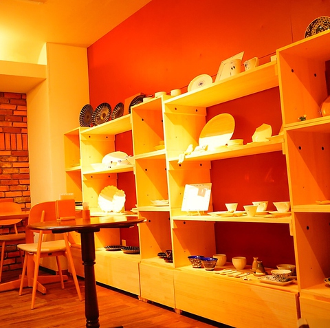 テーブル席のすぐ隣は、全国の作家さんたちの器が並ぶお洒落な空間。気に入ったものは、購入していただくことも可能。