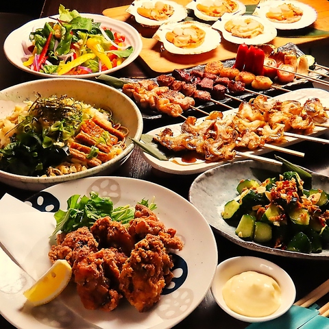「炭火串焼き盛り合わせ」からはじまり、名物の「燻製刺&炙り刺盛り合わせ」、「グリル名物デカ唐揚げ」、「ホタテのバター焼き」など当店の自信作が目白押しの豪華なコース。〆にはきつねとわかめのガリそばなど◎うれしい飲み放題付。