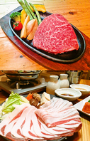 沖縄を代表するブランド牛の「石垣牛」を鉄板ステーキや炙り握りで!ブランド豚である「あぐー」をしゃぶしゃぶでどうぞ!!県産和牛の場合もあります
