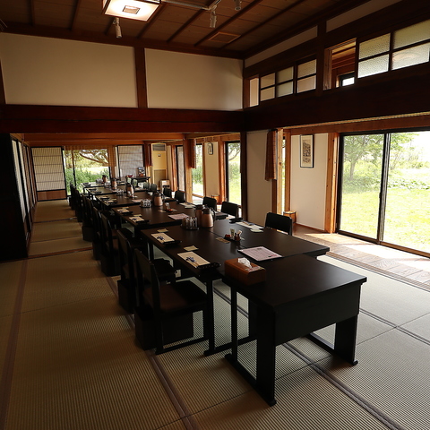 田んぼと畑に囲まれた、里山にたたずむ古屋敷そこに流れる、のんびりとした時間 ロビーとしてくつろぐ大いろりと、全席個室の食事席贅沢なひとときをお楽しみください