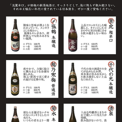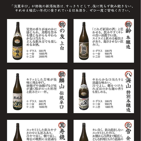 | 【プレミアム飲み放題】+500円 | ■ビール・スーパードライ ■日本酒・〆張鶴 本醸造・景虎 超辛口 ■果実酒・バナナ梅酒・大黒福梅・越後鶴亀 にごり ■焼酎・薩州宝山【芋】・黒丸【芋】・八重丸【麦】・鳥飼【米】・久米仙【泡盛】・ふんわり鏡月 |