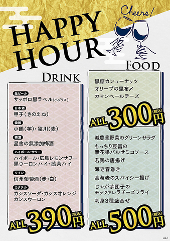 ~300円~黒糖カシューナッツオリーブの昆布〆カマンベールチーズ~500円~刺身3種盛り合わせ減農薬野菜のグリーンサラダもっちり豆腐の無花果バルサミコソース若鶏の唐揚げえび春巻き高海老のスパイシー揚げじゃが芋団子のモッツァレラチーズフライ