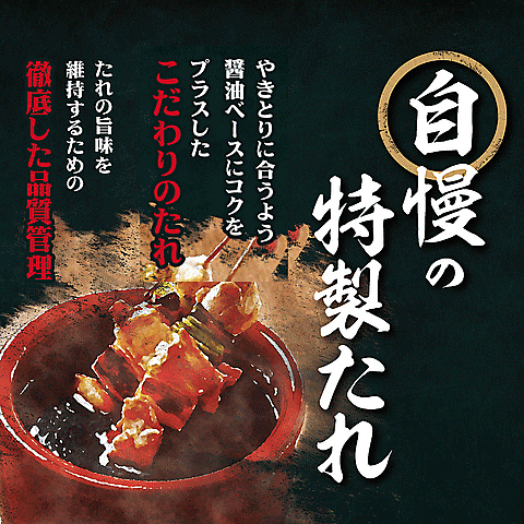 国産鶏使用・・「安心・安全」な商品をお客様にご提供します。 素材の鮮度・・適切な温度管理のもと短時間で店舗へ直送。 自慢の特製ダレ・・醤油ベースにザラメと国産手羽先チップでとった鶏の出汁を独自の配合でブレンド