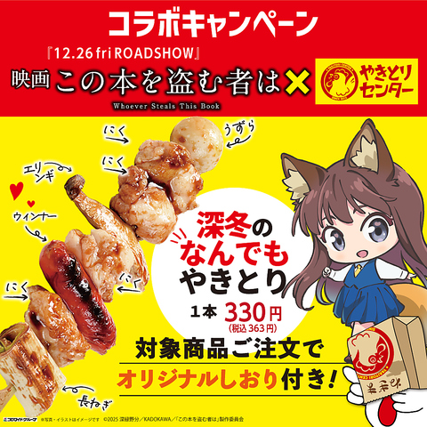 映画「この本を盗む者は」の公開を記念して、12/11(木)よりコラボメニュー「深冬のなんでも焼きとり330円(税込363円)」を販売スタート!コラボメニューを1品ご注文につき「オリジナルしおり1枚」プレゼント☆ぜひお試しください!※しおりはなくなり次第配布終了となります