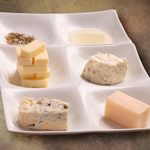 ゴルゴンゾーラ・ピカンテ、ブルサン、パルミジャーノ・レッジャーノ、チェダーブレンドの個性派チーズをパリッと香ばしいパパドにのせて、アカシア蜂蜜と黒胡椒共にやみつき必至のの永遠ループ。