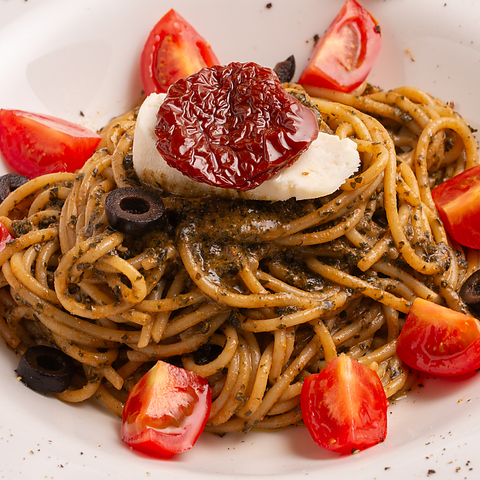 香り高い自家栽培バジルを1人前に50~60枚使用! 松の実、パルメザン、サラダトマト、ドライトマト、自家製チーズ、ブラックオリーブ、そらみつオリーブオイルを加え、素材の風味を存分に楽しめる贅沢な一皿。