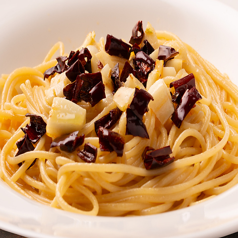 干しプルーンのような甘みとコク、ほのかな燻香が特徴のメキシコ産チレ・アンチョ。その個性的な唐辛子に、青森産にんにくの豊かな香りと高品質な「そらみつ」オリーブオイルを合わせた、素材を楽しむペペロンチーノ。
